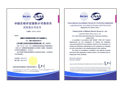 威腾电气集团股份有限公司产品检测中心,2020年4月26日喜获中国合格评定国家认可委员会颁发的实验室认可证书(注册号:CNAS L13278),获准41项试验项目的检测认可(低压电器31项、电工电子产品6项、金属材料4项)。该证书不仅标志着威腾电气产品检测中心的检测水平再上新台阶,具备了对外检测的能力;更标志着威腾电气正向着更标准化、更专业、更先进的领域发展!